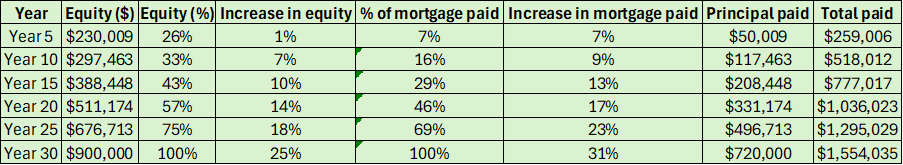 We can see that in the first 5 years (17% of the mortgage duration) only 7% mortgage has been paid! And an increase in equity of just 1%! $259,000 spent in total and only $50,000 of that towards decreasing the mortgage. The rest towards interest.