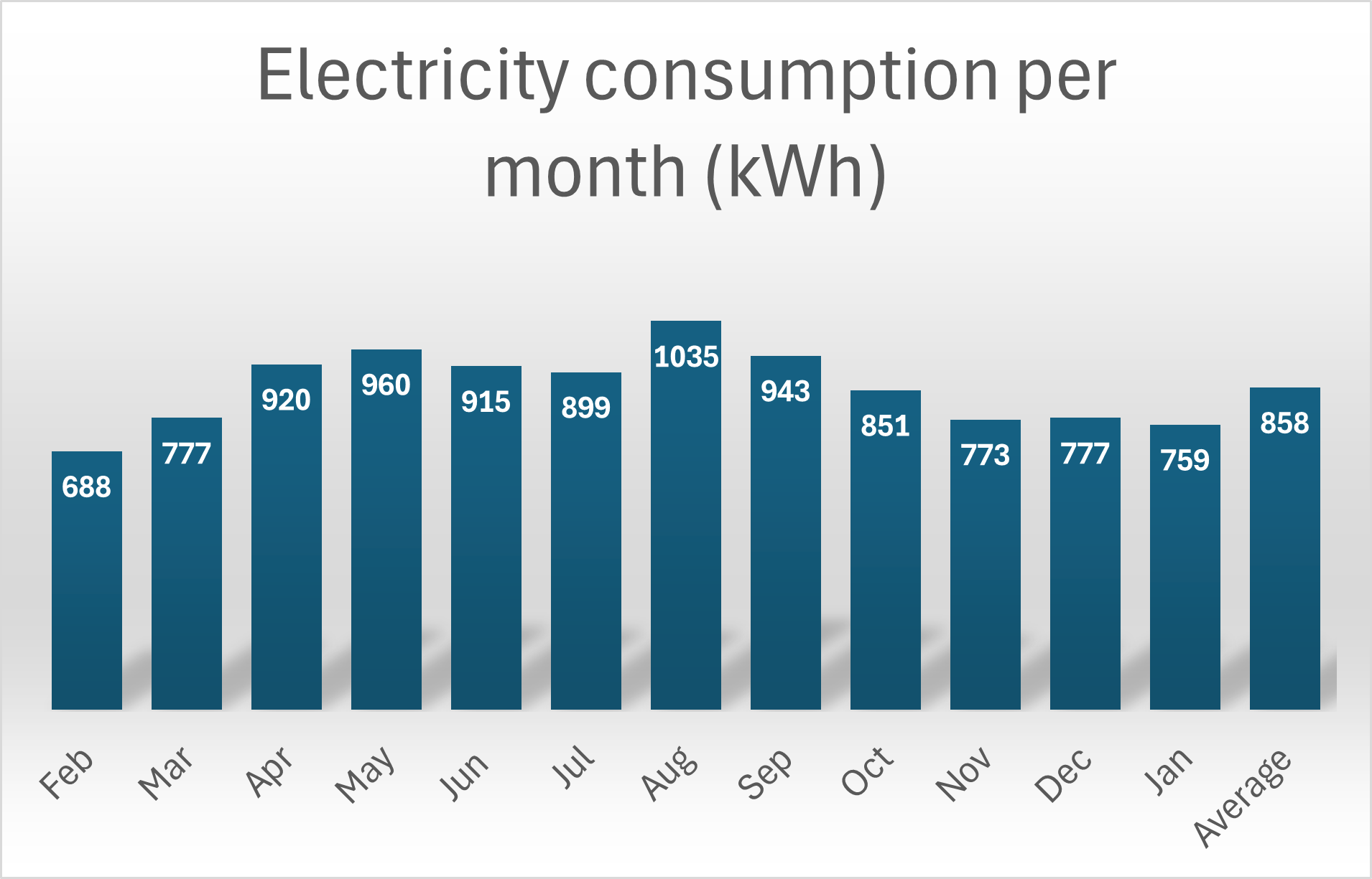Between February 2025 and January 2026 we averaged 746 kWh per month. Again, June the worst month at 360kWh, which equates to just 12 kWh per day.